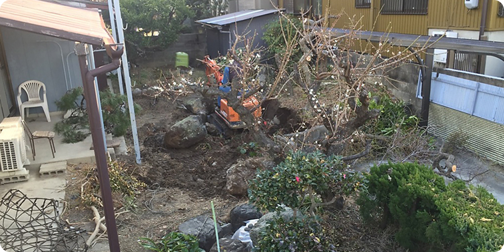 - 庭の解体の施工を行います。庭石の取り扱いや、和風庭園つくりで培った技術と知恵で、丁寧かつ心のこもった施工を心がけています。